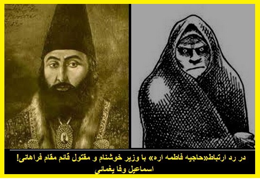 این جناب ب . فراهانی و سایر شخصیتهای ناشناس که اینگونه راست و حسینی همه را به توپ شربنل بسته اند لطفا اسم و رسم و عکس خود را به مقالاتشان اضافه کنند تا هم تهمت ترس و جبن به آنها زده نشود و هم استخوانهای مرحوم قائم مقام فراهانی در گور نلرزد که ممکن است خوشنامی این وزیر مقتول و ایراندوست محمد شاه قاجار(و مربی و پرورنده میرزا تقی خان امیر کبیر)با توجه به همنامی این فراهانی با آن فراهانی، زیر علامت سئوال برود و پس از حدود دو قرن(قتل 1214 خورشیدی) مشخص شود آن وزیر خوشنام مقتول ، در شبی ظلمانی،با فریب نفسانی و هواجس شیطانی در گوشه ای پنهانی چنانکه افتد و دانی و درغیاب والده بچه ها،باحاجیه فاطمه اره، جده اعلای چنین شخصیت شخیصی ماجرائی «فردیتی- جنسیتی» داشته که حاصلش پس از دو قرن چنین نبیره و نتیجه و وجود ادیب با تربیت و حقیقت گرائی است که باید جدا از اوهمزمان هم ادب آموخت و هم بقول ناصر الدینشاه پدر سوختگی یاد گرفت وهم بیاد مادرش قهوه ای خورد.