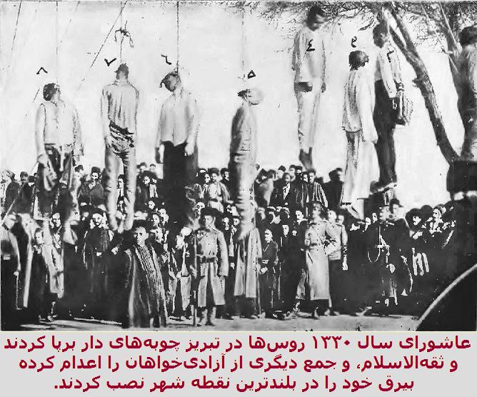 53) یکشنبه نهم دی ماه ۱۲۹۰خورشیدی (عاشورای ۱۳۳۰ = سیویک دسامبر ۱۹۱۱م)، روسها در تبریز چوبههای دار برپا کردند و ثقهالاسلام، پسران علی مسیو که یکی از آنها تنها شانزده سال سن داشت و جمع دیگری از آزادیخواهان را اعدام کرده، بیرق خود را در بلندترین نقطه شهر نصب کردند.