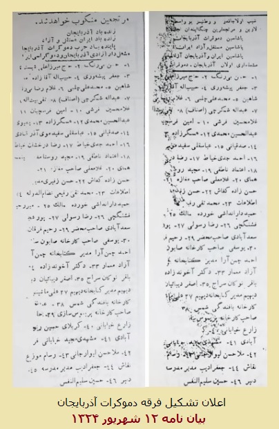 - نامه پیشهوری و یارانش به استالین و رهبری شوروی، که درخواست اسلحه میکنند و اشاره غیرمستقیم به این موضوع که فرقه میتواند استقلال آذربایجان از ایران را اعلام کند.