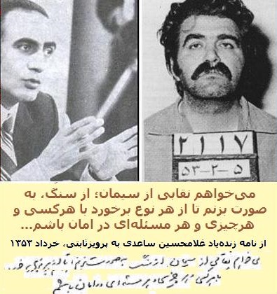 در همان مصاحبه، دکتر غلامحسین ساعدی با اشاره به دوران زندانی بودن خودشان (در رژیم پیشین) میگویند «...دوباره مرا از آنجا برداشتند چشم هایم را بستند. بردتد اتاق شکنجه، آویزان کردند به سقف و شکنجه کردند. تمام لباسهای مرا از تنم کندند. روی یک تخت انداختند.هم دستهایم را به سقف بستند و هم پاهایم را و تستفاده از یخ و سیخ و اینا. این مسخرهبازیها را که تمام کردند گفتند این حرف نمیزنه و مرا به تخت بستند. به من الکتروشوک وارد کردند[شوک الکتریکی دادند] بعد از چند بار الکتروش، مرا باز کردن. بخاطر تاثیر الکتروشوک مثل یه تخم مرغ تنم از وسط قطع شده باشد بدون اینکه زرده تخم مرغ خارج شپذ فقطجسم تخم مرغ داره رد میشه و بعد مرا مجبور کردندروی زمین سخت راه بروم...» دکتر ساعدی در زندان شاه کم رنج ندید. خرداد سال ۵۳ در نامه به آقای پرویز ثابتی نوشته «می خواهم نقابی از سیمان، از سنگ، به صورت زنم تا از هر نوع برخورد با هر کسی و هر چیزی و هر مسئلهای در امان باشم.»