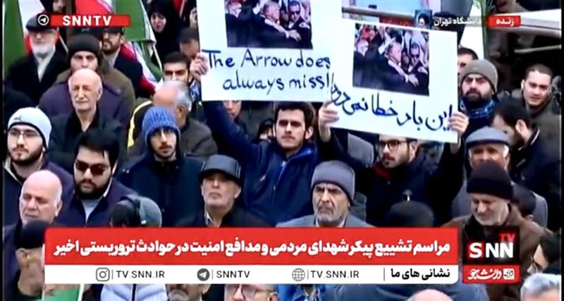 تصویر منتشرشده از مراسم حکومت برای ماموران و نیروهای کشتهشده خود در روز چهارشنبه در تهران نشان میدهد پلاکاردی در این مراسم دونالد ترامپ، رییسجمهوری آمریکا را به تکرار تیراندازی به او و اینبار «بدون خطا» تهدید کرده است.