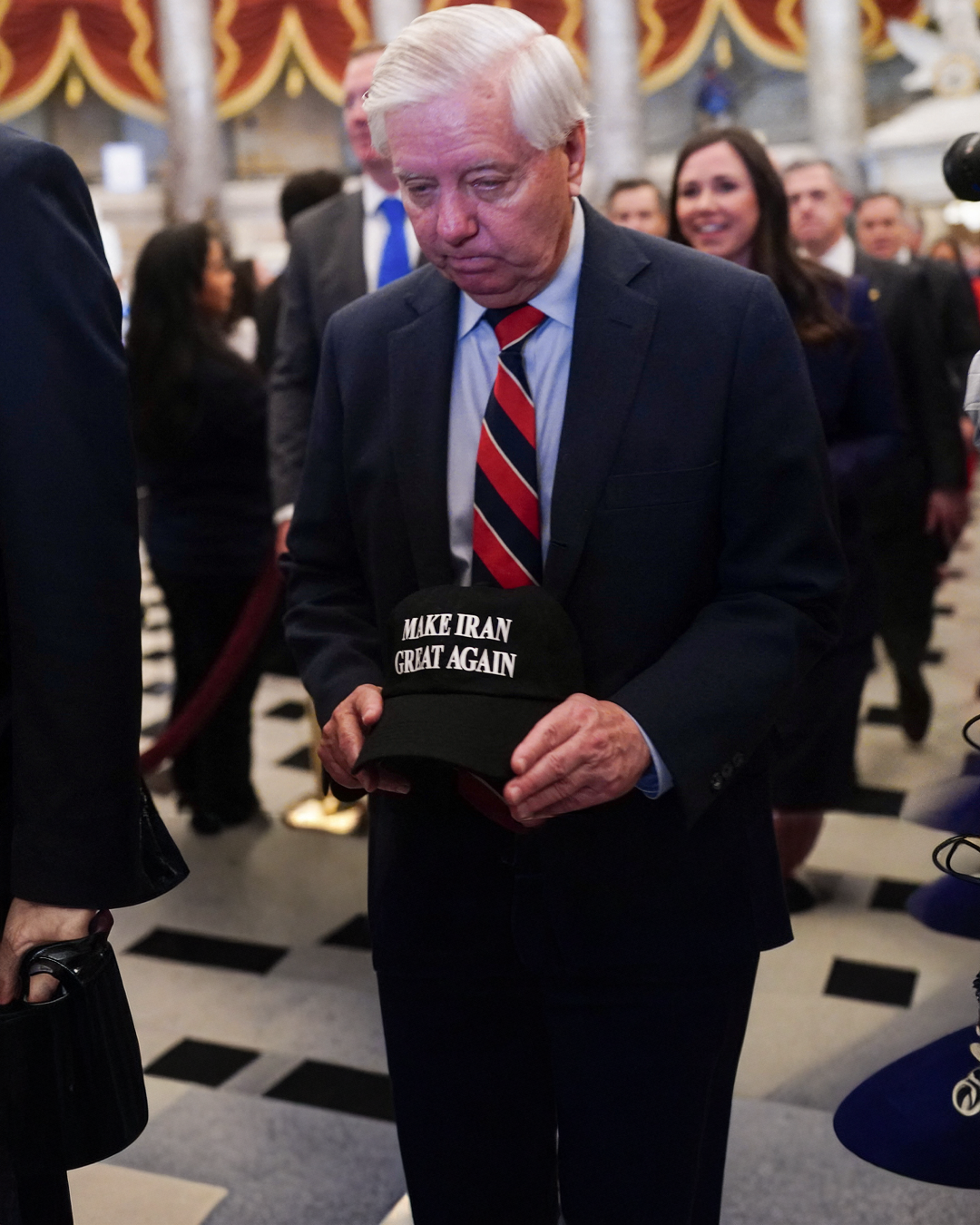 لیندزی گراهام، سناتور جمهوریخواه در حالی برای شنیدن سخنرانی سالانه دونالد ترامپ، رییسجمهوری آمریکادر کنگره حضور پیدا کرد که کلاهی را در دست داشت و روی آن نوشته شده بود: «دوباره ایران را باعظمت کن».