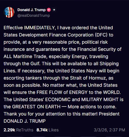 رئیسجمهوری آمریکا در شبکه اجتماعی تروث سوشال نوشت: «این خدمات برای تمامی شرکتهای کشتیرانی در دسترس خواهد بود.»