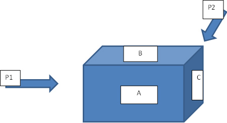 آن روزنه نمی گذاشت که آگاه بشویم. نمی دانستیم که این مربع بخشی از یک پدیده پیچیده است. پدیده ای که «حجم» دارد. که می تواند دارای محتوایی چند بُعدی باشد. نگاه محدود ما به آنچه می دیدیم، به ما «شناخت» محدود داده بود. و این شناخت نمی گذارد که ما از پدیده پیش روی، «تبیین» درستی داشته باشیم. بتوانیم آن پدیده را «روشن و واضح» بیان کنیم. حال اگر زاویه دید ما از جایگاه و زاویه P2 باشد، و در اینحالت فقط به یک نقطه (گوشه) نگاه کنیم، برداشت ما از آنچه که می بینیم، فقط یک «نقطه» است. نه سطح A, B,C را می بینیم، و نه اینکه می دانیم با یک شئی چند بُعدی روبرو هستیم.