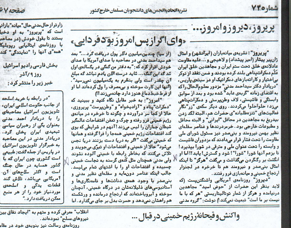 کمیسیون قضایی، که همچون کمیسیون «امنیت و ضد تروریسم» مسئولیت آن بعهده یک «انقلاب کرده» از«سربازان مریم و مسعود» است، و در برابر این همه نامردمی و احکام ظالمانه یی که علیه دگراندیشان یا وکلای مدافع متعهد و مردم دوست، توسط رژیم ملاها طی سالهای گذشته صادر شده، گویی در «کما» فرو رفته بود و صدایی از آن شنیده نشد و اگر هم اطلاعیه یی صادر کرده باشد، با توجه به موارد متعدد احکام ظالمانه صادره شده، موردی استثنایی بوده است، حالا در اطلاعیه ای بدون جواب دادن به سؤالی مربوط به مساله یی انسانی که مساله اصلی نوشته اسماعیل وفا یغمایی بوده است(سرنوشت همسر سابق و مادر فرزندش)، در مورد اتهامات مربوط به طلاقهای اجباری و گسترده، که همه از وقوع آن در تشکیلات مجاهدین خبر دارند، دعوت به طرح دعوا کرده است. مهمل بافی و برچسب زنی دو «کمیسیون شورای ملی مقاومت»، در مورد سوال اسماعیل وفا یغمایی و مسائلی که در نوشته خود مطرح کرده بود- که به طور کلی و در جزئیات، مربوط به روابط و سوابق او در ارتباط با سازمان مجاهدین و به عنوان یک عضو سابق آن بوده است و ربطی به «شورای ملی مقاومت» ندارد -، به مفتضحانه ترین صورت، پوشالی و آلت دست بودن آن شورا و «آلترناتیو دموکراتیک»، را نشان داد. این عربده کشی ها و نسق گیری ها اما، به رغم این که ظاهری «رعب انگیز» دارد، بیانگر وحشت و نگرانی رهبری جبّار و خودسر مجاهدین از انتقادات و نوشته های ایرج مصداقی و اسماعیل وفا یغمایی است که از زمان «انقلاب ایدئولوژیک»، چنگ و دندان نشان دادن برای دریدن، و بکار بردن الفاظ زشت و توهین آمیز در رویکرد به منتقدان و مخالفان خود پیش گرفت و در این زمینه گاه گوی سبقت از رسانه های خمینی را هم بردند چرا که روش اینان کمترین نسبتی با روش و رویکردی که از یک «الترناتیو دموکراتیک» انتظار می رفت، نداشت، بلکه حتی برخوردی سیاسی نبود. فحاشی برای رضایت خاطر از احساس قلدر بودن بود. توهین و تحقیر دیگران برای ارضای حس خود برتر بینی بود. نگارنده بارها از زمان انقلاب ایدئولوژیک این روش مجاهدین را مورد انتقاد قرار دادم که یک نمونه آن نامه ای بود به «دفتر سیاسی مجاهدین» در خرداد سال ۱۳۶۴ که فتوکپی آن را دارم و در آن بخشی از سخنان جناب مهدی ابریشمچی در یک سخنرانی عمومی برای توضیح در مورد انقلاب ایدئولوژیک را که طی آن تمام منتقدان مجاهدین را خائن و ضد انقلاب و... نامیده بود، مورد انتقاد قرار دادم و از این گونه برخورد با منتقدان اظهار نگرانی کردم، همچنان که نکاتی از نامه های«بیعت» با رهبری نوین را که در نشریه مجاهد درج شده بود نیز مورد انتقاد قرار دادم. انقلاب ایدئولوژیک گویی رویدادی بود که طی آن، اینان در یک دگردیسی انحطاطی، و از این رو به رو شدن، در برابر انتقاد و منتقدان به جای پاسخ، چنگ و دندان نشان دادن و حرمت شکنی و ارعاب را به عنوان روش انتخاب کردند. حرف من با حضرات این بود که این روش به زیان خود آنها است و فضای بدبینی و بی اعتمادی نسبت به خودشان را دامن میزند. شاید یک نمونه مناسب برای یاد آوری از اختلاف نظر و انتقاد من از روش و رویکرد اینان به مخالفان و منتقدانشان، الفاظی بود که اینها در مطلبی در «نشریه اتحادیه انجمن های دانشجویا مسلمان خارج کشور» علیه دریادار مدنی بکار گرفته بودند. یک بار(زمان آن درست یادم نیست به نظرم می آید قبل از فروغ جاویدان بود، شاید سال 66) به طور شفاهی با یکی از اعضای مجاهدین که به عنوان نماینده مسئول شورا در تحریریه نشریه شورا حضور می یافت، به طور خصوصی در این مورد صحبت کردم و گفتم بکار بردن چنین الفاظی در نشریه متعلق به مجاهدین، در مورد هرکس و با هر خطایی که باشد، کار درستی نیست و این در افکار عمومی به زیان مجاهدین است. خوب به یاد دارم که دو سه هفته بعد، دوباره همان متن در نشریه اتحادیه ... درج شد و این در واقع پاسخی بود به انتقاد من که یعنی «ما اینیم». چند سال بعد از این ماجرا بعداز عضویتم در شورا در اولین جلسه یی که به عنوان عضو، در نشستی که با حضور م