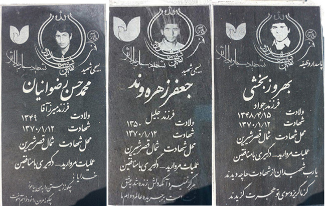 هر سه نفر بر اساس آنچه روی سنگ قبرهایشان نوشته شده است بسیجی و سپاهی بوده و در «عملیات مروارید» و در «درگیری با منافقین» در «شمال قصر شیرین» کشته شدهاند و اجساد هیچکدام نیز به دست نیامده و «جاویدالاثر» هستند که نشانگر کشته شدن آنها در خاک عراق است. تاریخ کشته شدن هر سه نفر ۱۲ فروردین ۱۳۷۰ و مطابق با اطلاعیه مجاهدین است.