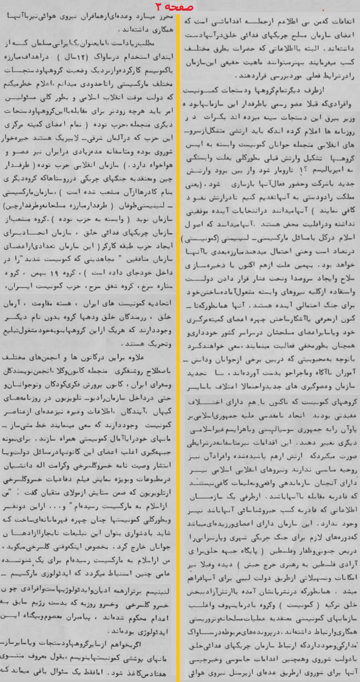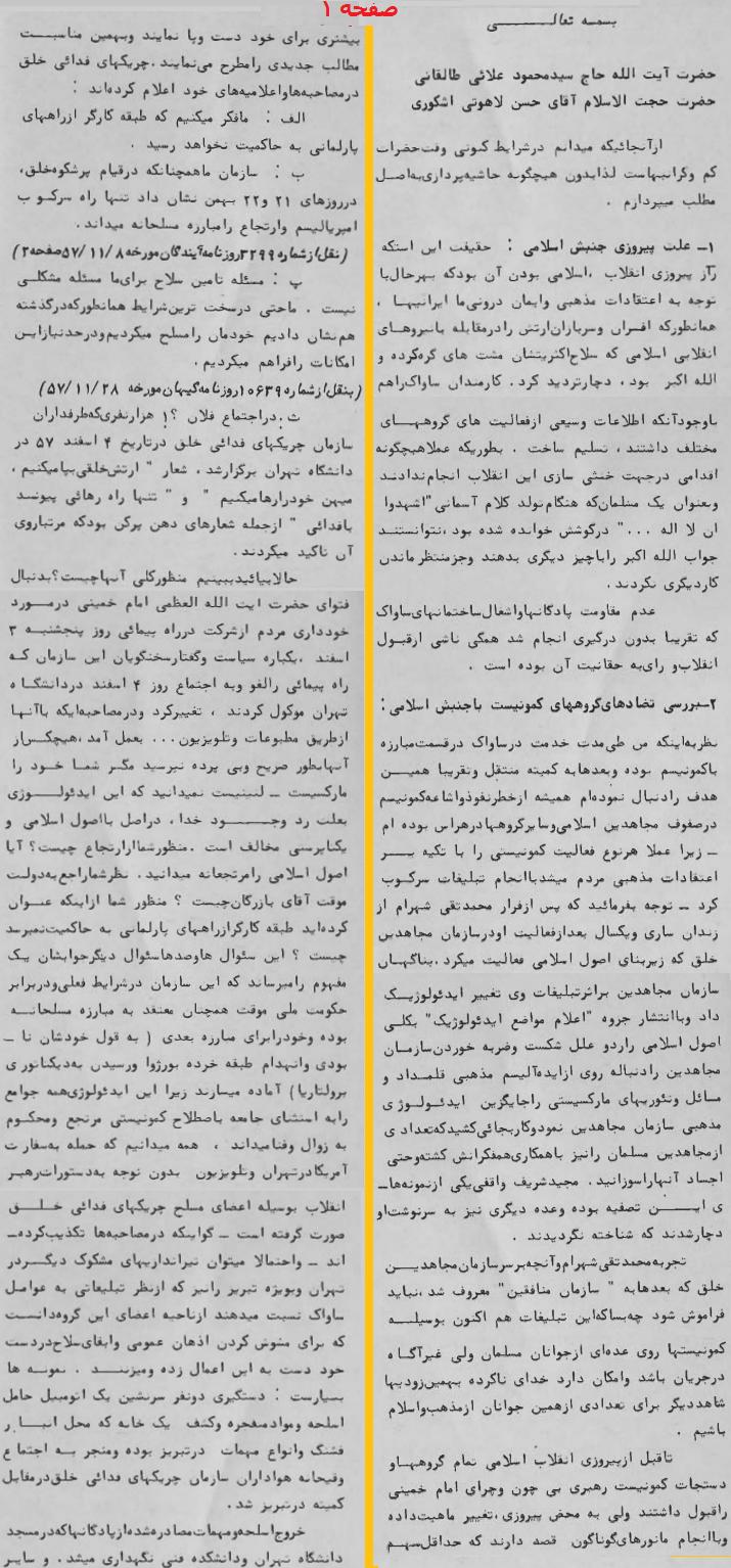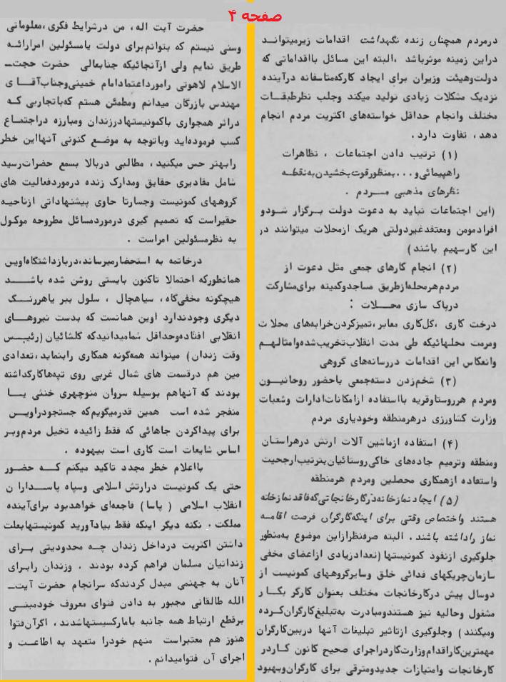 «بسمه تعالی. با توجه به زیانهای ناشی از زندگی جمعی مسلمانها با مارکسیستها و اعتبار اجتماعی که آنها بدست میآورند و با در نظرگرفتن همه جهات شرعی و سیاسی و با توجه به حکم قطعی نجاست کفار از جمله مارکسیستها، جدائی مسلمانها از مارکسیستها در زندان لازم و هرگونه مسامحه در این امر موجب زیانهای جبران ناپذیر خواهد شد.»