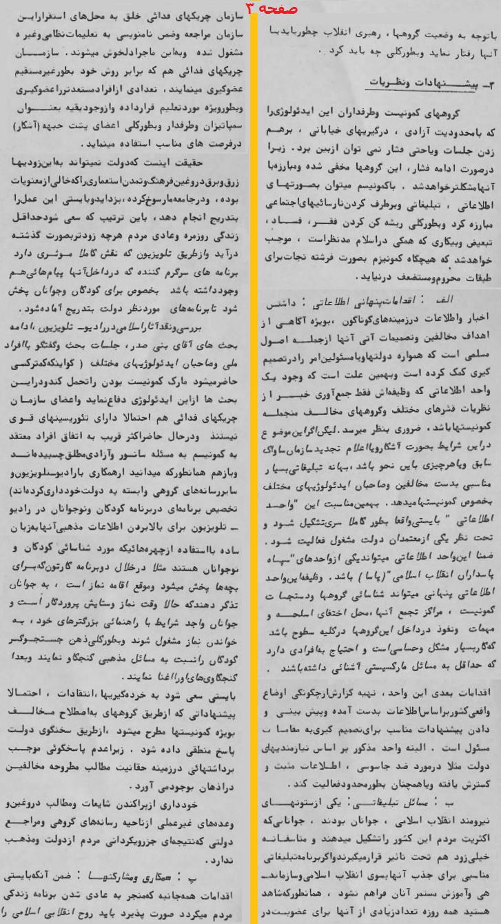 برگردیم به نامه تهرانی به آیتالله طالقانی و آیتالله لاهوتی. نامه مزبور با مسامحه نوعی «چه باید کرد» است و او از طریق آنان به حاکمان جدید خط میدهد که باید با کار اطلاعاتی مستمر و سّری، کمونیستها و غیرکمونیستها را مهار کنند وگرنه آنان در آینده به مشکلات دامن میزنند...